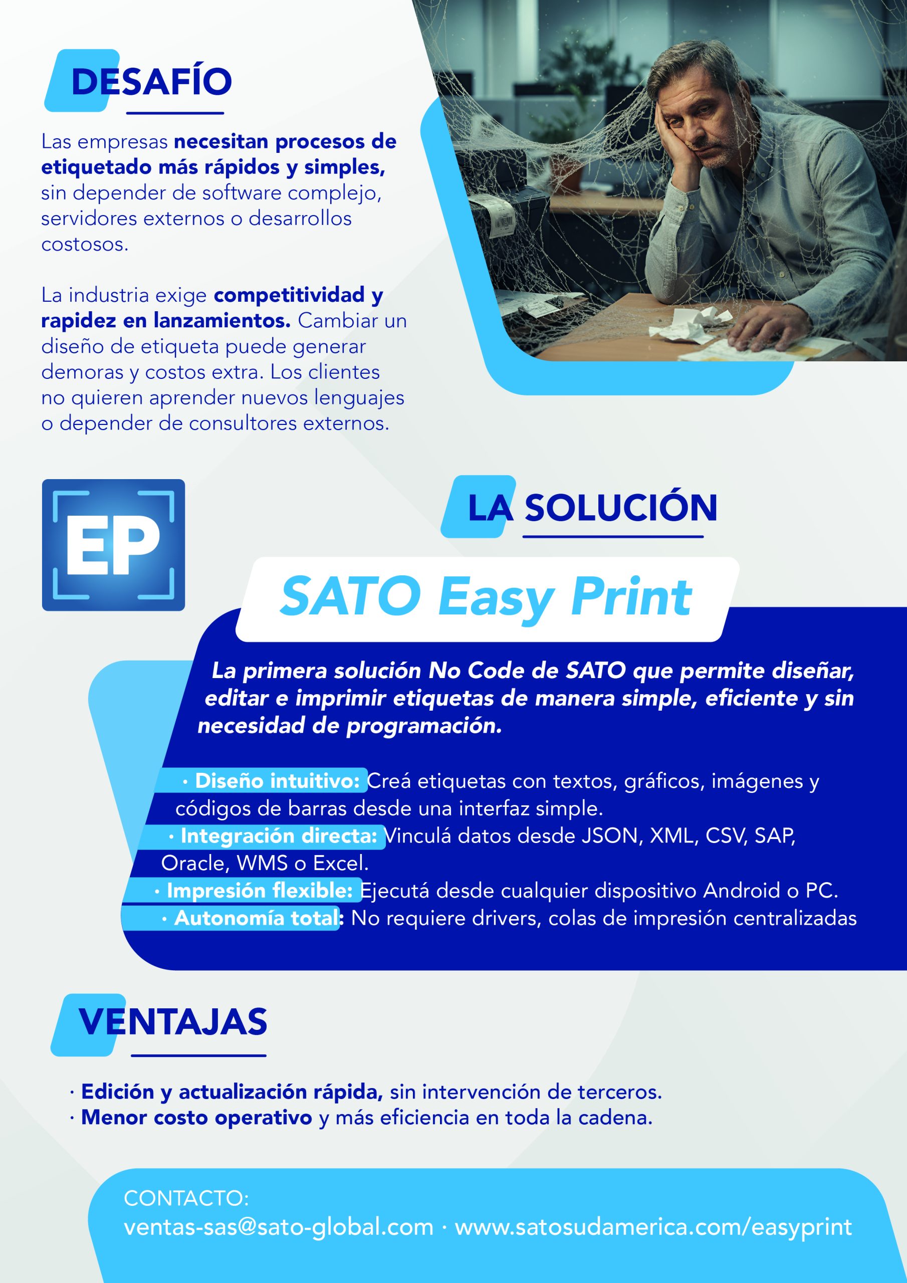 En SATO entendemos que el etiquetado no debería ser un obstáculo, sino una herramienta de eficiencia. Por eso creamos SATO Easy Print, la primera solución No Code que simplifica todo el proceso de diseño e impresión de etiquetas, sin necesidad de programación. MÁS SIMPLE. MÁS RÁPIDO.